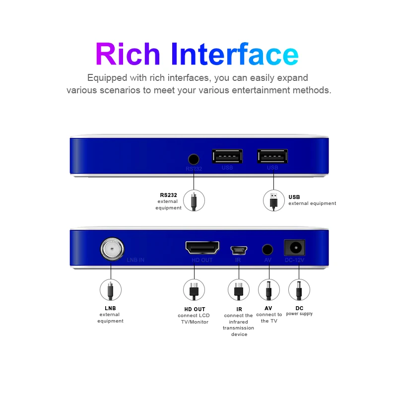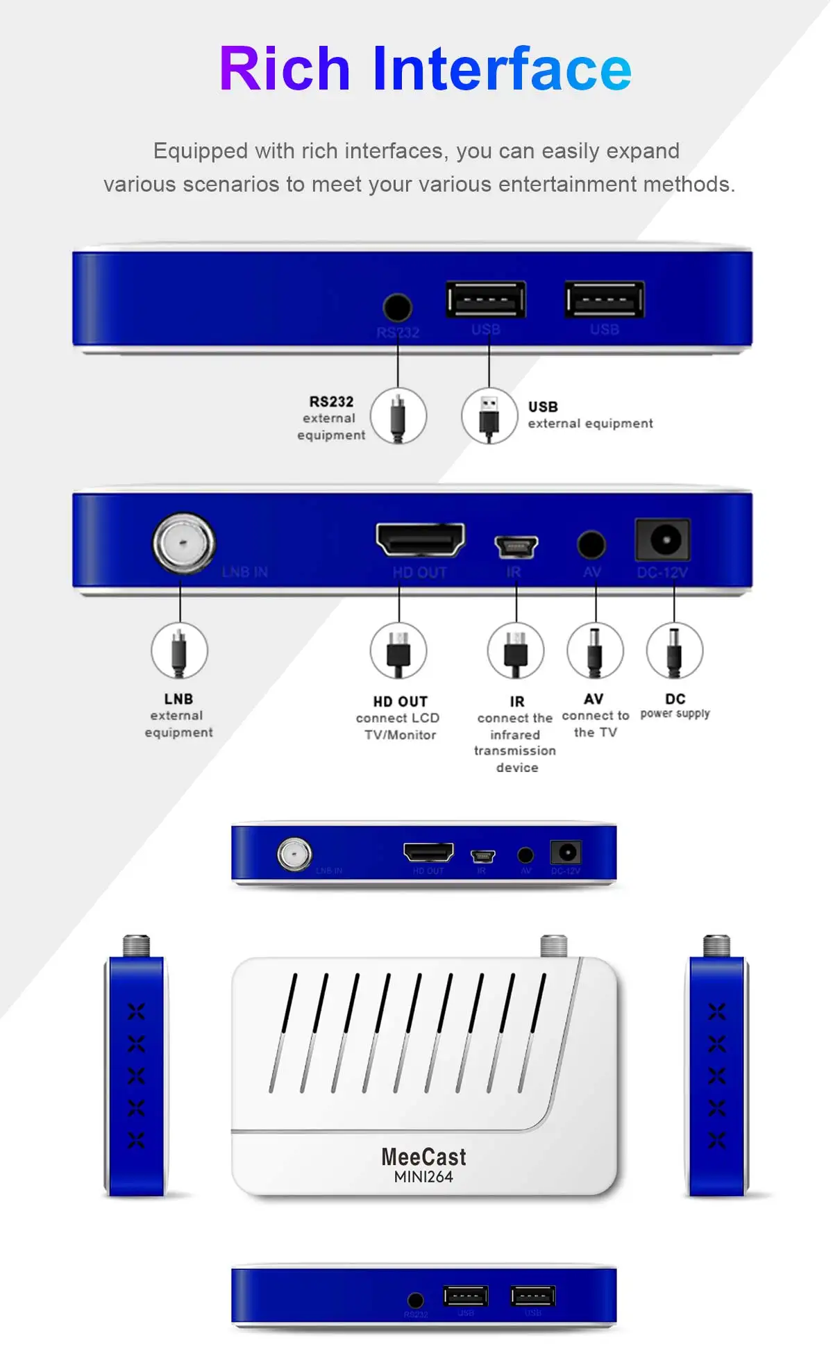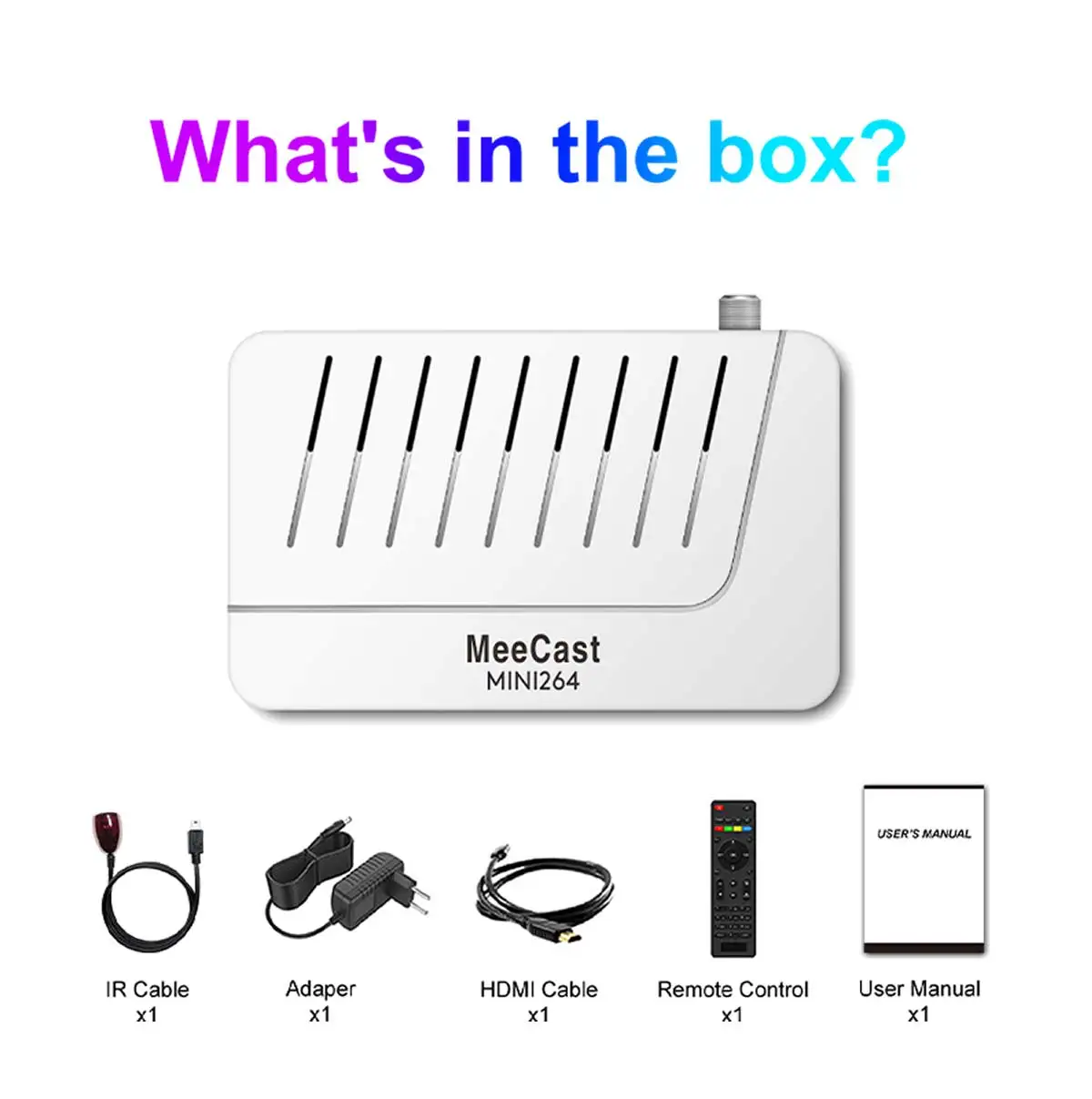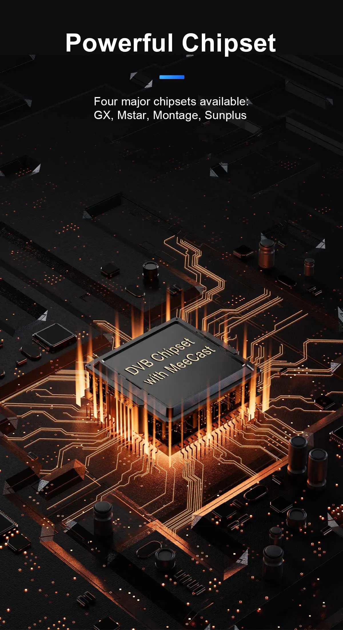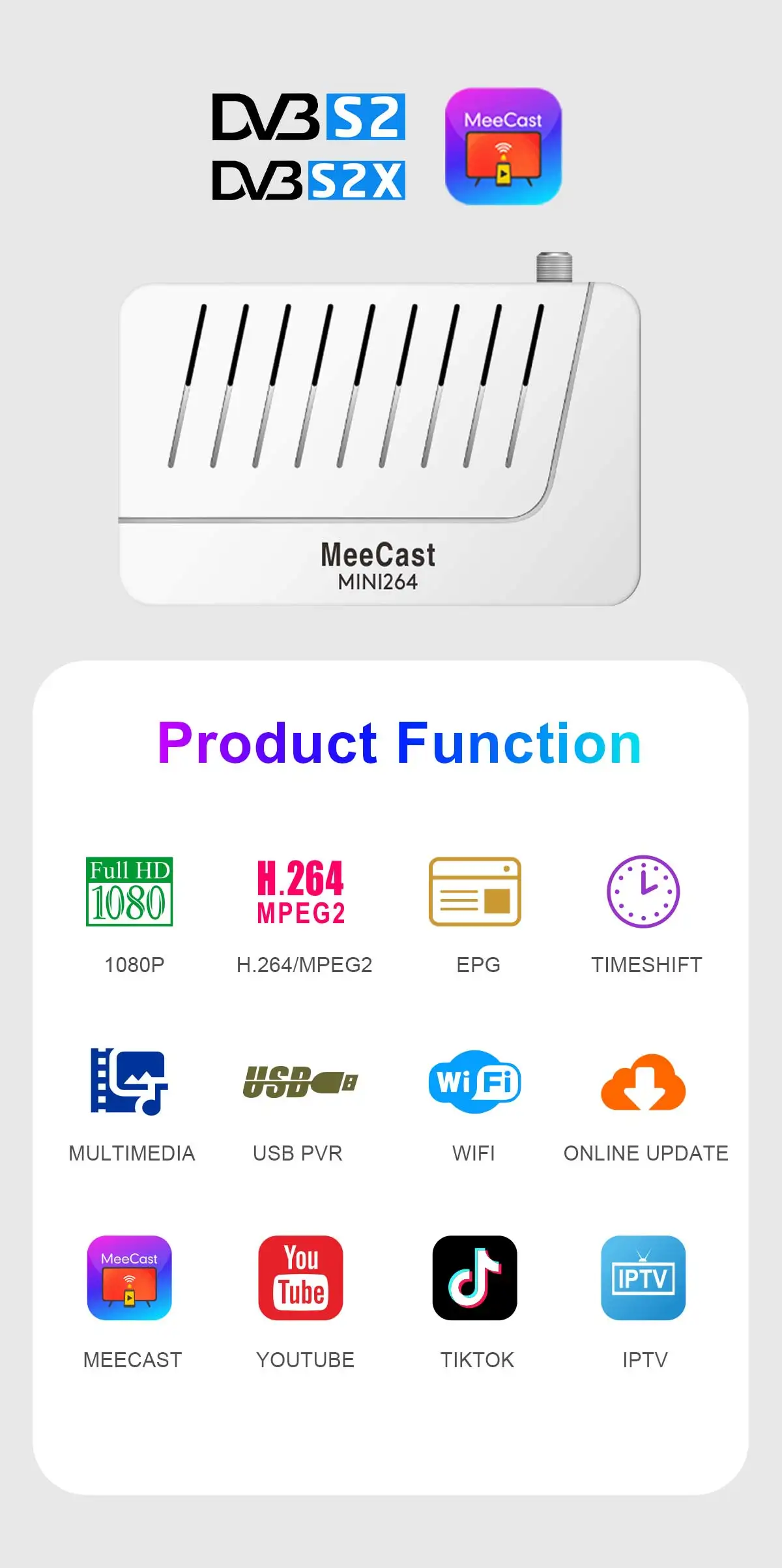 DVB-S2, FTA, HD, MeeCast, USB PVR, EPG, USB Wi-Fi, IP-TV, Youtube, MeeTube, Tiktok, Online Upgrading, CAS optional |