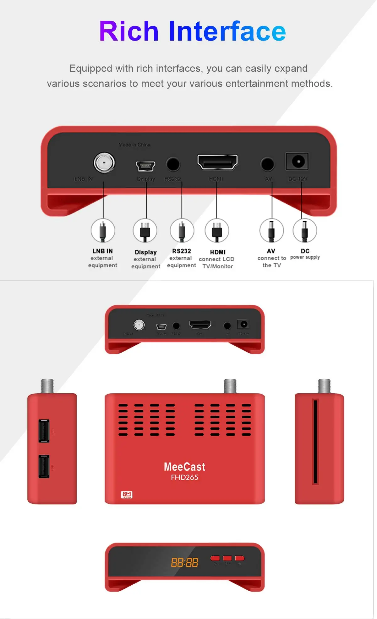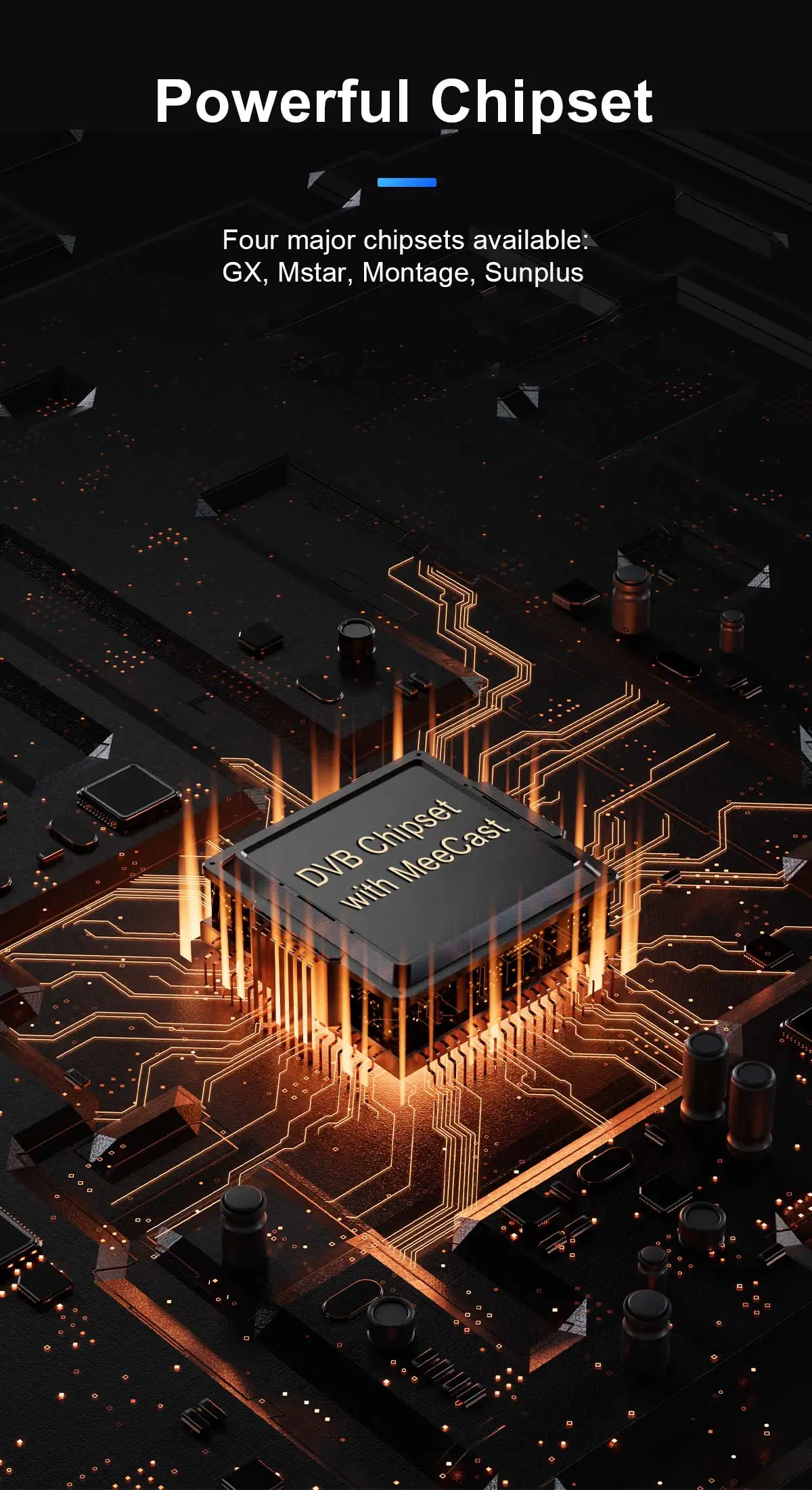 GX6605H, DVB-S2, FTA, H.265/HEVC HD, MeeCast, USB PVR, EPG, USB Wi-Fi, IP-TV, Youtube, MeeTube, Tiktok, ఆన్లైన్ అప్గ్రేడింగ్, CAS ఐచ్ఛికం |